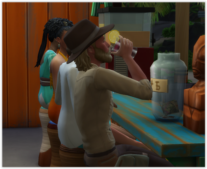 Il tente le bar local. Il est déçu. C'est mal éclairé (j'ai dû rajouter une lampe), Les gens se masse devant la mini-télé posée sur une des tables, Nalani est partie, les toilettes sont dehors au fond du "jardin"... Bref, le seul truc à sauver, ce sont les cocktails...