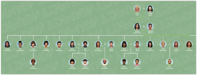L'arbre généalogique sur TheSimstree de Josefina et Howard jusqu'à Kory à peu près au moment ou Kory fini ses études à Britchester. Après elle, elle a trois frères: Lounis, Marlon et Nino.